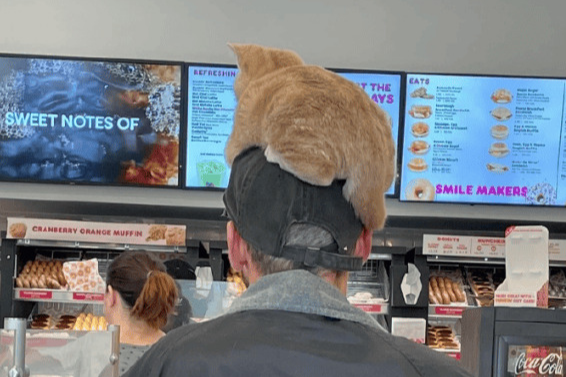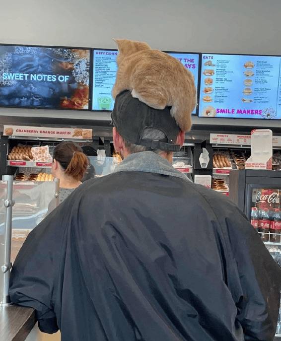 고양이가 집사의 머리 위에 있는데 놀랍도록 침착한 모습이 인상적입니다. 모자가 된 고양이가 여유로운 자세를 취하는 고양이의 모습이 정말 사랑스럽습니다.