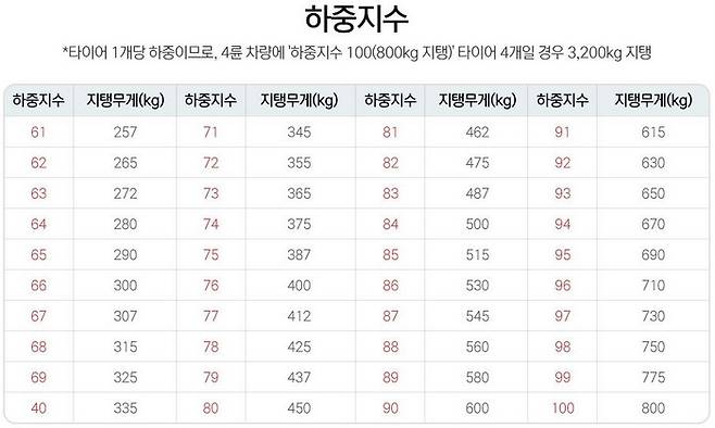 하중지수란 타이어 하나의 최대 하중을 의미하며, 하중지수가 100인 타이어는 최대 800kg의 무게를 버틸 수 있다. 일반 승용차에 하중지수가 100인 타이어를 4개 장착하면 총 3,200kg의 무게를 버틸 수 있는 셈이다. 이를 통해 내 차가 견딜 수 있는 최대치의 인원과 화물 무게를 가늠해볼 수 있다.