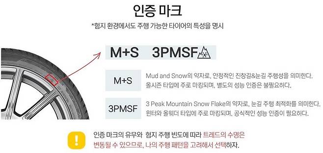 타이어의 인증 마크는 해당 타이어가 안정적으로 주행 가능한 환경을 나타낸다. M+S 마크는 진창길과 눈길에서 주행 가능함을 의미하지만, 제조사의 자체 기준으로도 마킹이 가능하다.