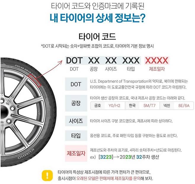 타이어의 사이드월에는 DOT로 시작되는 코드가 있다. 이는 북미에 판매되는 모든 타이어에 새겨지는데, 제조일자를 포함한 다양한 정보들이 담겨 있다. 제조일자는 [주차+년도]로 표기되어 있다. 예를 들어, [3223]은 2023년 32주차에 생산된 것을 의미한다.