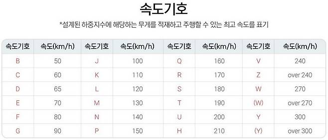 하중지수 옆에 새겨지는 속도기호는 타이어의 한계 하중에 따른 최고 주행 속도를 나타내는데, 각각의 속도를 의미하는 로마자로 표기되어 있어서 쉽게 확인할 수 있다. 다만 도표의 속도는 해당 타이어의 한계치이므로 안전한 주행 속도와는 다를 수 있는 사실을 참고하자.