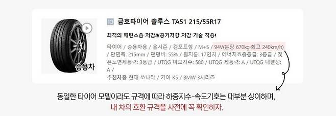 타이어의 성능에 따라 마킹된 하중지수와 속도기호는 같은 라인업(모델)의 타이어 제품이라고 해도 3대 규격(단면폭, 편평비, 휠지름)에 따라 대부분 상이하므로, 내 차에 호환되는 규격을 구매 전 반드시 확인하자.