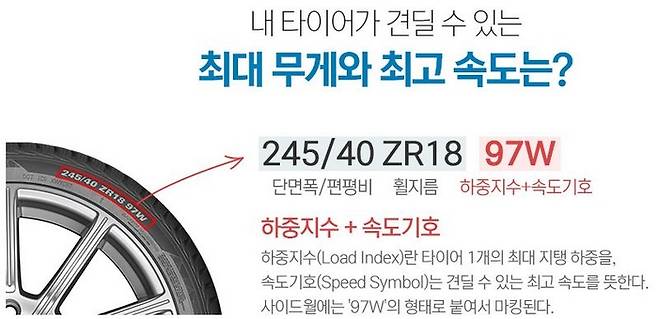 하중지수와 속도기호는 타이어의 사이드월에서 쉽게 확인할 수 있다. 3대 규격(단면폭/편평비/휠지름) 바로 옆에 '97W'의 형태로 마킹되는 하중지수와 속도기호는, 숫자 형태의 하중지수와 로마자 형태의 속도기호를 붙여서 표기한다. 먼저 하중지수에 대해 자세히 살펴보자.