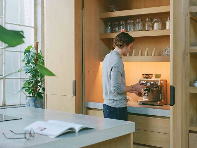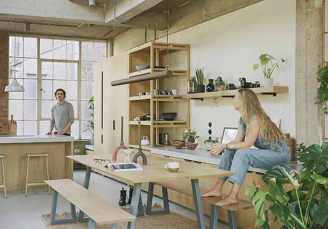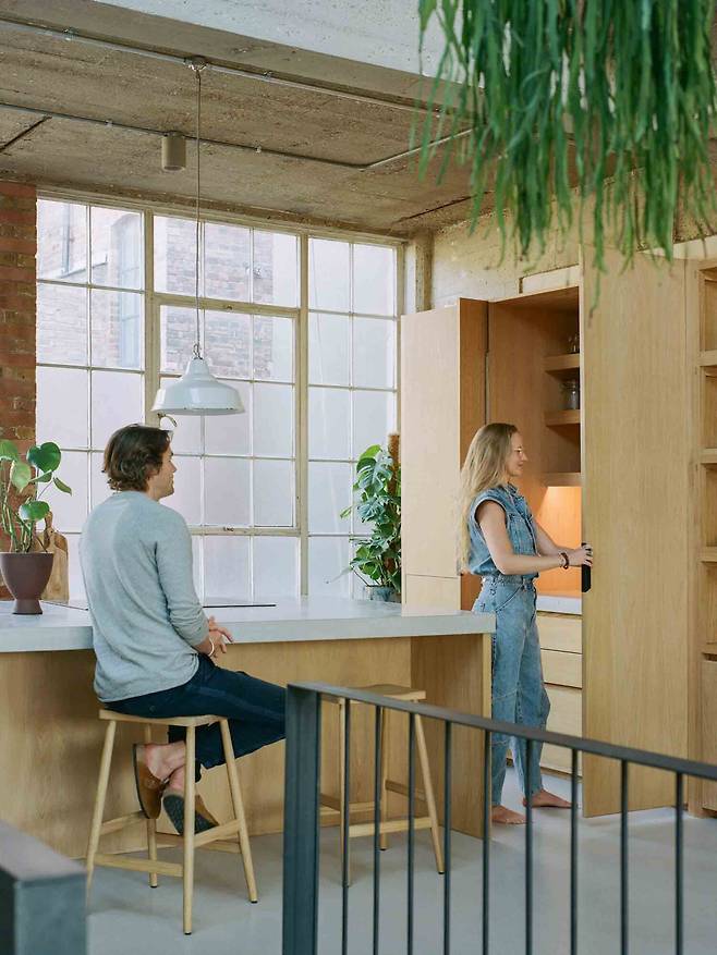 런던에 위치한 이 집은 기후 환경 운동가(Climate activists)와 영상 제작가 Jack Harries and Alice Aedy의 업무 공간이자 생활 공간이다.기존 건물이 공장으로 지어져 공간 자체가 집보다는 업무나 상업 시설의 분위기가 강하다. 리노베이션을 담당한 Studio McW 이런 공간의 장점을 활용해 사무 공간에 생활 공간을 입힌 듯한 분위기의 공간을 만들었다.일상에서는 잘 모르지만, 생각해 보면 업무 공간은 생활 공간에 비해 단순하고, 명확하다. 직원 수에 따라 가구 수가 많아지기는 하지만 집처럼 새로운 형태의 것들이 늘어나는 것이 아닌, 한 직원에게 필요한 만큼의 가구가 복사 붙이기처럼 같은 것이 늘어난다.그래서 사무실이 뭔가 많아 보일지는 모르지만 사실, 한정된 가구들이 직원 수에 따라 채워져 있을 뿐이다. 이런 사무 공간의 문법(법칙)을 활용해 목재를 사용한 미니멀 스타일로 인테리어를 진행했다.