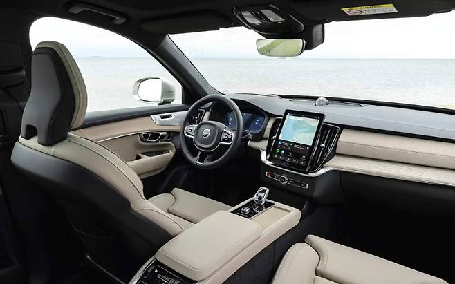 실내에는 더 커진 11.2인치 화면에 새로운 레이아웃의 구글 기반 인포테인먼트 시스템이 탑재되었습니다. 새로운 디스플레이는 밝고 선명하며 직관적인 레이아웃을 제공하지만, 터치 반응 속도가 가끔 느리게 느껴질 수 있습니다. 새로운 인테리어 트림 옵션도 추가되었는데, 특히 네이비 온 네이비 헤링본 옵션은 2세대 XC90부터 시작된 볼보의 섬세한 테일러링 기술을 엿볼 수 있게 합니다. 시트 소재는 재활용 폴리에틸렌으로 제작되었으며, 나파 가죽뿐만 아니라 새로운 인조 가죽 옵션도 제공됩니다. 앰비언트 라이트는 화려한 애쉬 우드 트림을 비추도록 변경되었습니다.