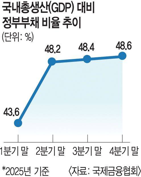 국제금융협회(IIF) 기준으로도 정부부채 비율은 지난해 4분기 말 48.6%로 1년 전보다 5.0% 포인트 상승하며 역대 최고치를 기록했다. 미국(122.8%) 일본(199.3%) 프랑스(110.4%) 영국(81.1%) 독일(62.5%) 등 주요국과 대비해 절대 수준은 낮은 편이다. 하지만 증가 속도가 이례적으로 빠르다는 점이 부담 요인으로 지목된다. 정부부채 비율은 2024년 40%대 초중반에서 하락 흐름을 보이다가 지난해 들어 다시 상승세로 전환해 단기간에 50%에 근접했다.