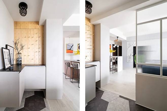 입구에 들어서자마자 가장 먼저 눈에 들어오는 것은 회색과 검정의 육각형 타일로 이루어진 바닥이다. 다채로운 기하학적 패턴이 바닥에 펼쳐져 있어 단조로움을 없애고 시선을 사로잡는다. L자형 신발장은 자연스럽게 동선의 출발을 안내하며, 입구에 실용성과 미적 감각을 더해준다.