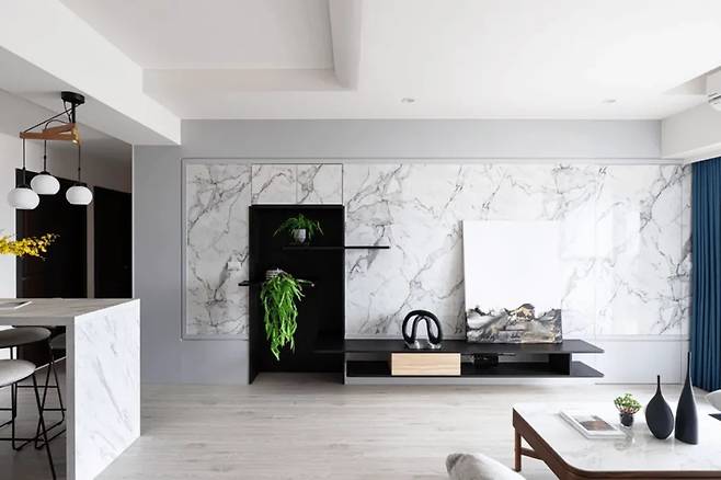 기존의 TV 벽을 새로운 시각으로 재구성하여 독특한 공간감을 부여했다. 5.5미터에 이르는 벽면은 자연스러운 질감의 실버 폭스 패턴 패널로 마감되어, 들어서는 순간부터 깊고 우아한 인상을 남긴다.