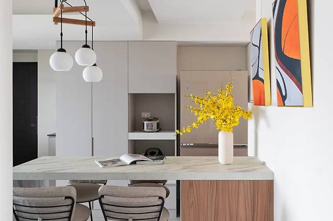 중앙에 위치한 하얀색 아일랜드 바는 다이닝 테이블로도 활용된다. 주방과 거실 사이에서 기능적으로, 또한 완충 역할을 하며 공간을 효율적으로 사용하도록 돕는다.