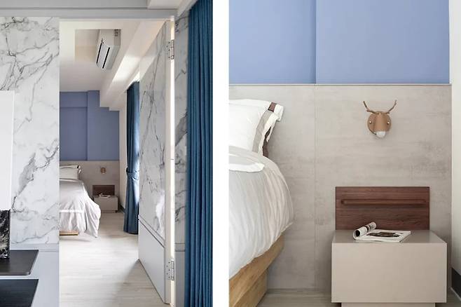 부부의 취향을 반영하여 선택된 짙은 파란색 벽이 방의 중심을 잡아준다. 매입등과 벽등이 깔끔하게 연결되어 있으며, 낮은 수납장은 절제된 디자인으로 편안한 수면 환경을 조성한다.