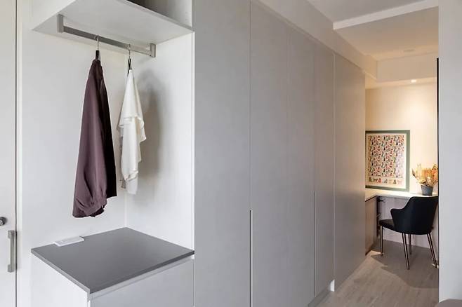 침실과 자연스럽게 연결된 드레스룸은 반오픈형으로 설계되었다. 벽면에는 문이 달린 수납장이 줄지어 있어 먼지 없이 의류를 보관할 수 있도록 배려했다.