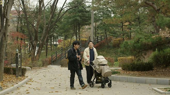 이어지는 작품의 주요 축은 '승진'(박종환)과 '필재'(곽민규)가 아파트 인근 공원에서 유모차를 끌면서 이어지는 대화로, 둘 사이의 대화는 마치 <고도를 기다리며>에서 '고도'를 기다리는 인물들처럼 겉돌기를 반복한다.