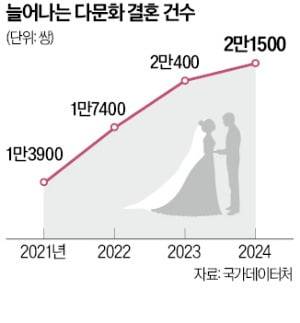 국가데이터처가 6일 발표한 '2024년 다문화 인구동태 통계'에 따르면 지난해 다문화 혼인 건수는 2만1450건으로 전년보다 5.0%(1019건) 증가했다.