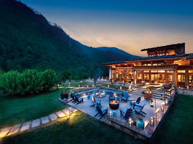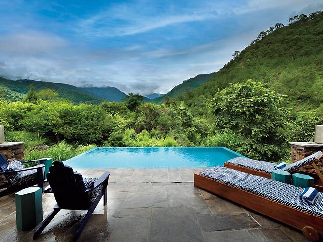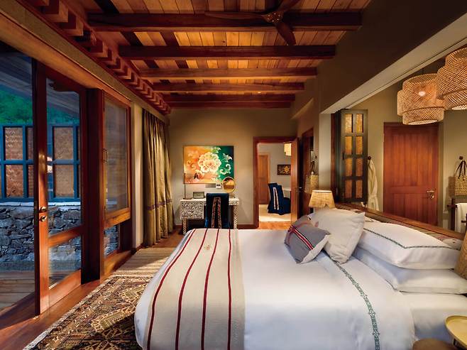 드넓게 펼쳐진 논과 숲이 우거진 언덕, 그 사이로 강이 흐르는 푸나카는 부탄에서도 아름답기로 소문난 곳이다. 지난가을 오픈한 앤비욘드 푸나카 리버 로지는 그런 푸나카를 120% 즐길 수 있는 곳이다. 부탄의 국화인 히말라야 푸른 양귀비 문양, 부탄산 모직을 사용한 담요와 의자 커버, 금박을 입힌 목공예품으로 꾸민 6개 텐트 스위트룸과 2개 빌라에서는 평화로움과 고요함을 오롯이 느낄 수 있다. 웰니스 프로그램도 잘 갖췄는데, 특히 모추(Mo Chu)강의 물 흐르는 소리를 배경으로 진행하는 요가 프로그램이 매력적이다. 자연과 가까운 이점을 활용해 하이킹, 사이클링, 래프팅, 카야킹 등 다채로운 액티비티가 가능해 활동적인 이에겐 이만한 숙소가 없다.