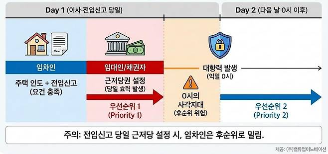 이로 인해 소위 ‘0시의 사각지대’가 발생할 수 있습니다. 예를 들어, 임차인이 이사와 전입신고를 마친 당일 저녁에 임대인이 제3자로부터 대출을 받고 근저당권을 설정한다면, 근저당권은 당일 즉시 효력이 발생하는 반면 임차인의 대항력은 이튿날 발생하여 후순위로 밀리게 됩니다.