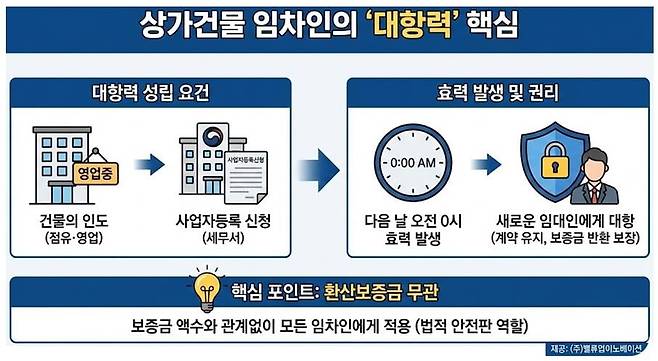 상가건물 임대차보호법의 적용을 받는 임차인 역시 주택과 궤를 같이하는 견고한 대항력 체계를 갖추고 있습니다.