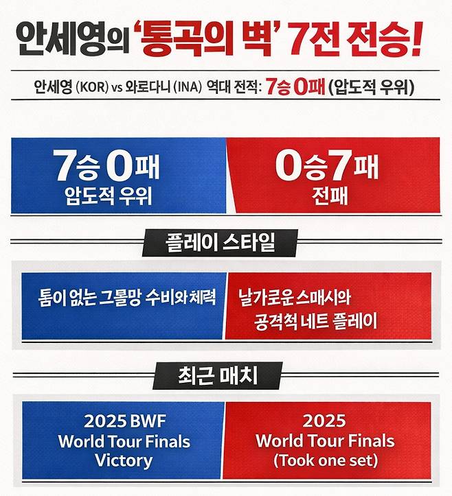기록상으로는 안세영이 와르다니에게 ‘통곡의 벽’ 그 자체다. 지금까지 일곱 번을 싸워 안세영이 전승을 거두고 있다.