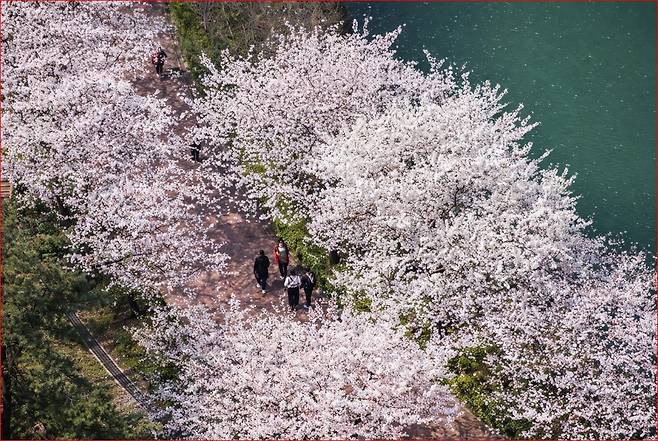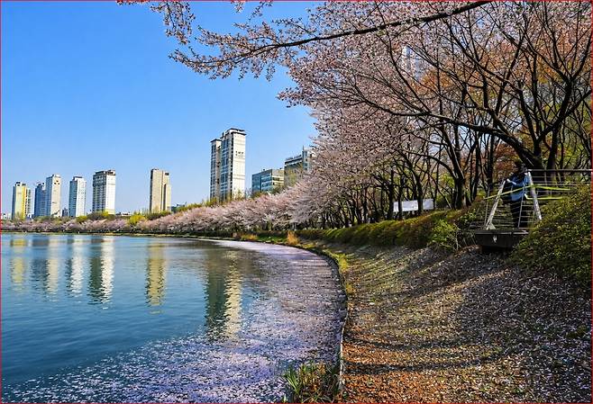 봄바람을 맞으며 호숫가를 걷다 보면 머리 위로는 벚꽃 터널이, 발아래로는 잔잔한 호수가 펼쳐지며 도심 속이라고는 믿기지 않는 몽환적인 풍경을 선사합니다.