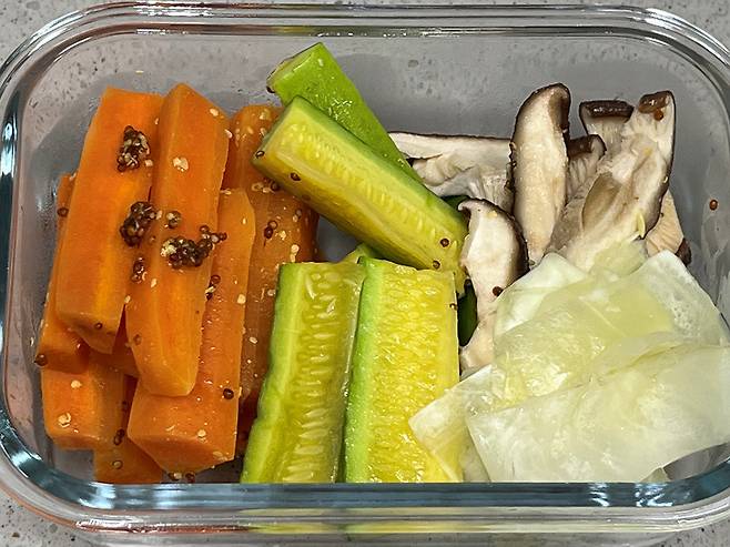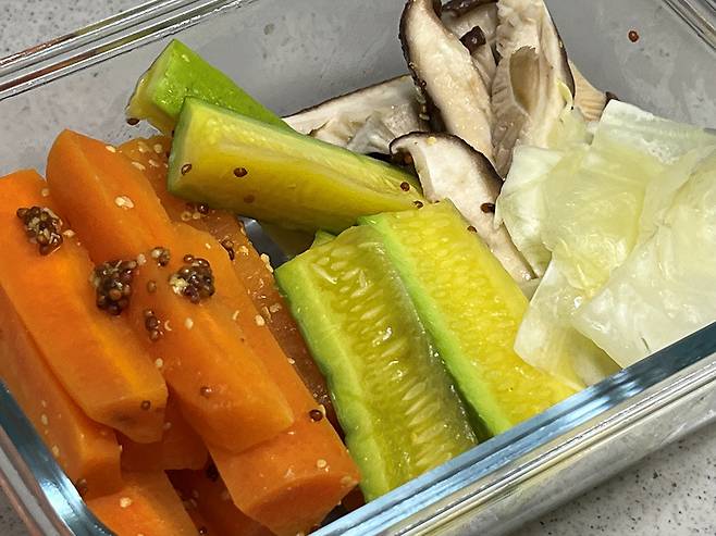 표고버섯도 동일하게 맛소금과 참기름으로 간을 합니다. 물론 심심한 맛이 좋다면 간 없이 그냥 야채만 드셔도 무방합니다.