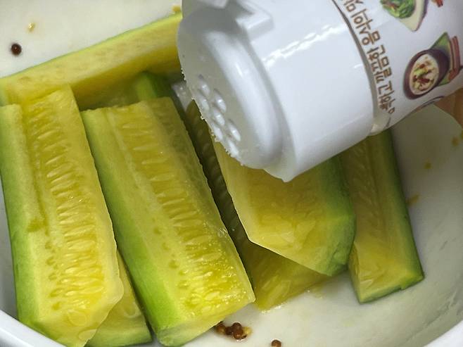 호박 반 개 기준으로 맛소금 4~5꼬집 뿌려서 밑간을 한 다음 참기름에 무쳐 줍니다. 이렇게 간단하게만 간을 해도 훨씬 맛있어요.