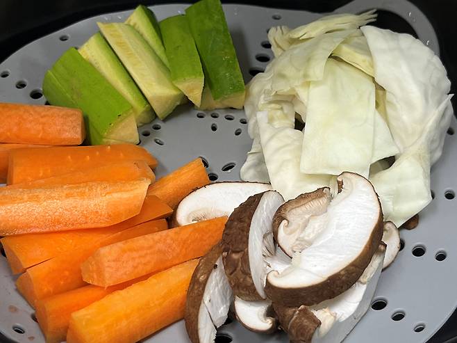 야채는 먹기 좋은 크기로 잘라서 준비하세요. 쪄 먹기 좋은 야채로 당근, 호박, 버섯, 양배추를 준비했습니다.