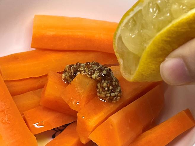 당근은 그냥 먹어도 맛있지만 씨겨자와 올리브오일 등으로 무치면 감칠맛이 살아나 더욱 맛있게 즐길 수 있습니다.