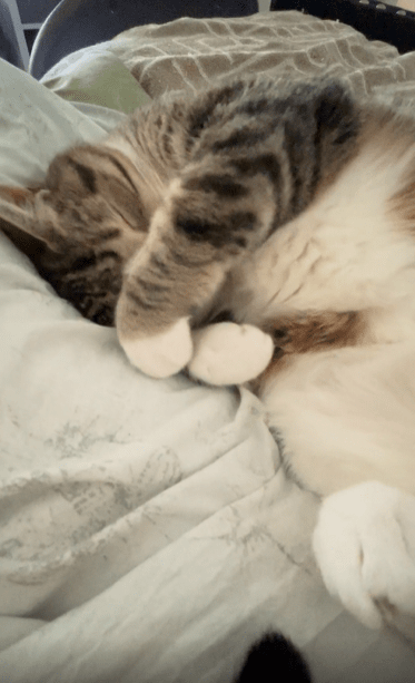 그런데 고양이는 곧 몸을 다시 꾹 말아 웅크립니다. 마치 “아니야, 아직 아니야… 지금은 아니라고” 하고 중얼대는 듯, 몸 전체를 작게 오므리며 다시 처음보다 더 단단히 말아버립니다. 눈은 여전히 가려져 있고, 귀는 조금 더 납작해지며 다시 잠의 세계로 돌아가려 애쓰는 모습입니다.