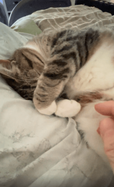 하지만 이 고요함을 깨는 건 아주 작은 손가락 하나. 주인이 고양이의 통통한 배를 살짝 콕 찌르자, 고양이의 몸이 순간적으로 퍼지는 듯 늘어납니다. 고양이의 등과 배가 느슨하게 풀어지고, 앞발도 살짝 풀어지며 잠에서 깨어나려는 기운이 일어나는 듯한 순간.