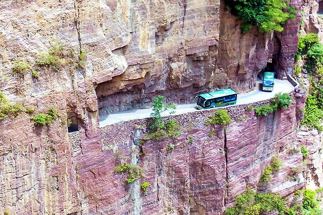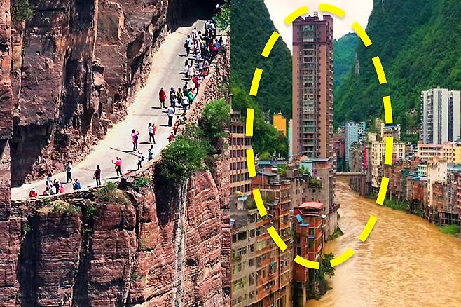 중국은 관광업이 발전하면서 깎아지른 듯한 절벽 사이에 잔도를 설치하는 붐까지 일고 있는데요. 특히 90도의 암벽에 길이라고는 널빤지가 유일해 세상에서 가장 위험한 절벽 길이라 불리는 산시성화산 장공잔도도 많은 관광객을 불러 모으고 있죠.