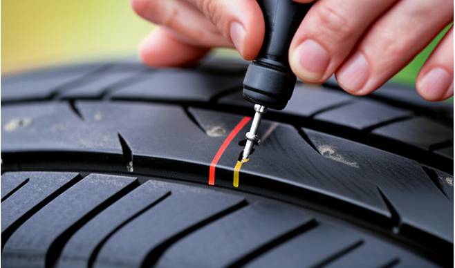 5. T자형 핸들 제거 및 리페어 스틱 절단: 리페어 스틱이 삽입된 상태에서 T자형 핸들을 조심스럽게 빼냅니다. 칼 또는 가위를 사용하여 타이어 표면에서 5mm 정도 남기고 리페어 스틱의 남은 부분을 잘라냅니다. 너무 짧게 자르면 빠질 수 있고, 너무 길게 남기면 주행 중 손상될 수 있으므로 적절한 길이를 유지하는 것이 중요합니다.