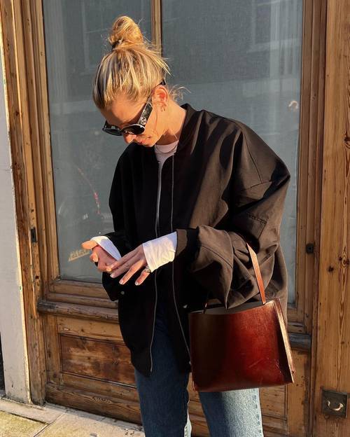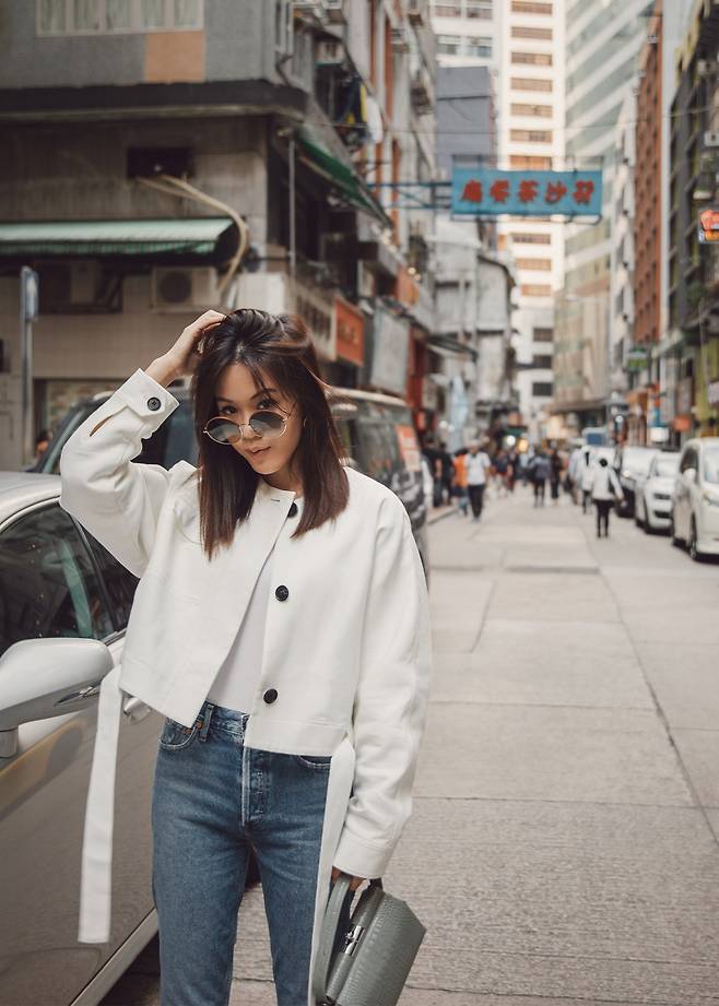 블랙 컬러 가방을 매치해 심플하면서도 트렌디한 감성을 살렸네요