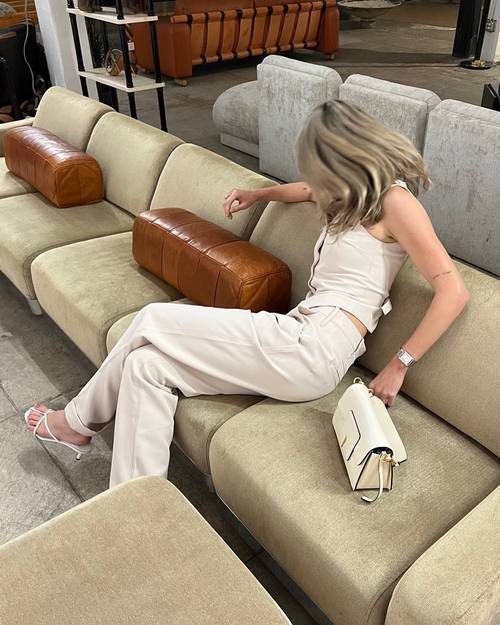 루에브르 가방과 함께한 그녀, 아이보리 컬러 자켓에 대비되는