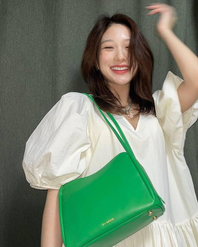 서연은 화사한 컬러감의 원피스에 그린 컬러 조이그라이슨 가방을 더해