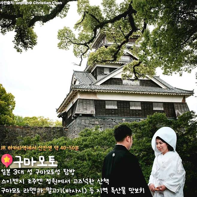 후쿠오카 근교 여행지 중 일본의 전통적인 매력을 제대로 느낄 수 있는 곳은 단연 구마모토다. 일본 3대 성(나고야, 오사카, 구마모토)으로 불리는 구마모토성은 1607년 가토 기요마사가 최신 방어 기술을 접목해 완성한 견고하면서도 아름다운 성이다.