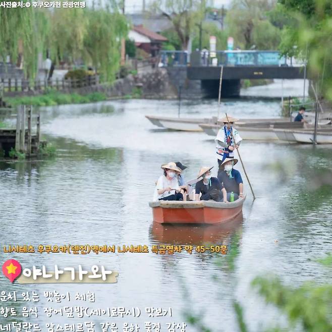 니시테츠 후쿠오카(덴진)역에서 니시테츠 특급열차 타고 약 50분이면 도착하는 야나가와는 운치 있는 뱃놀이를 즐길 수 있다.