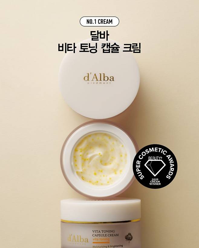 기존의 크림과 캡슐이 자연스럽게 어우러지는 더블 텍스처는 유지하되, 패키지는 일체형으로 업그레이드돼 사용감은 물론 위생과 보관까지 모두 향상되었다. 수분 베이스 위에 퍼지는 비타민 캡슐이 피부에 선명한 생기와 맑은 톤을 부여하고, 달바 독자 특허 성분인 트러페롤™(흰서양송로추출물, 토코페롤)이 피부의 기초 체력을 다져주고, 아데노신이 주름 개선에 도움을 주는 이크림은 ‘기미·잡티 케어와 안티에이징을 동시*에 잡은 토털 솔루션’이라는 평가로 2025 <뷰티쁠> 슈퍼 코스메틱 어워드 ‘크림’ 부문 1위에 선정되었다.