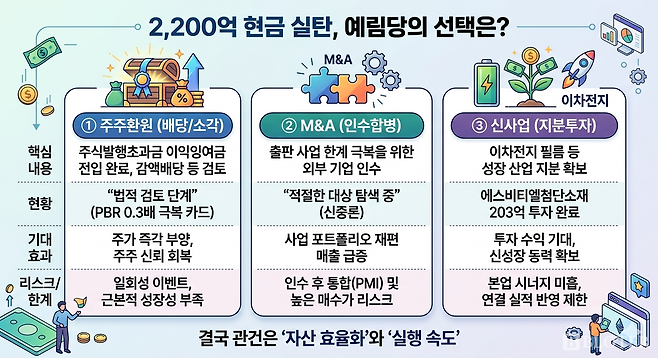 배당은 기업가치 저평가 국면에서 직접적인 주주환원 수단으로 꼽힌다. PBR 0.3배 수준에서는 자사주 매입 후 소각이나 배당이 주가에 즉각적인 영향을 줄 수 있는 수단으로 평가된다. 한계도 명확하다. 배당은 일회성 이벤트에 그칠 가능성이 높아, 근본적인 성장 동력 확보와는 거리가 있다.