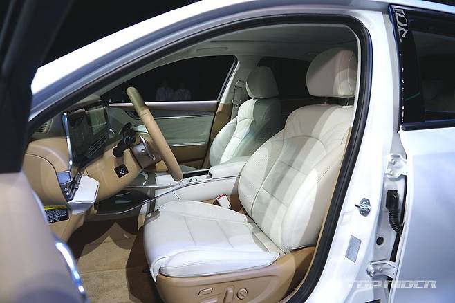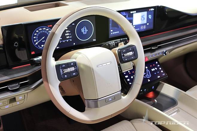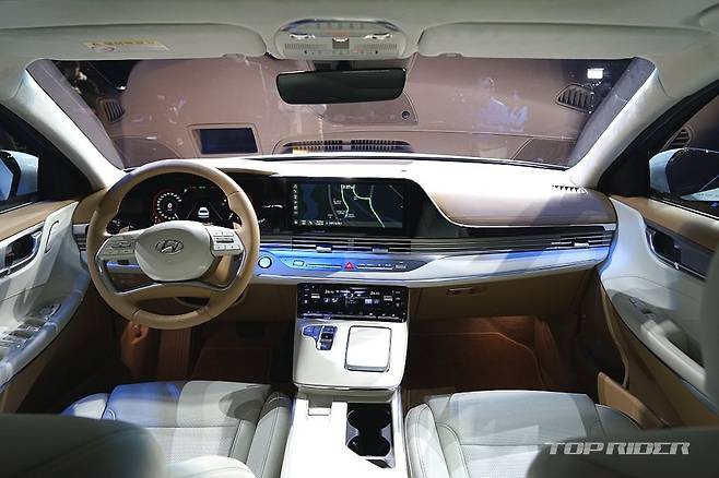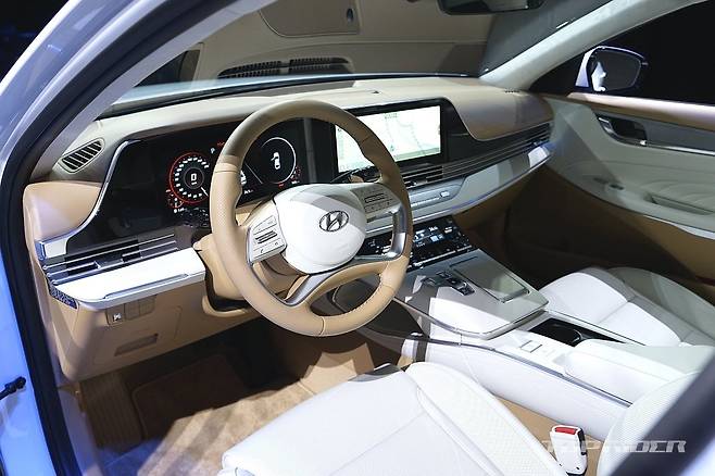 실내는 12.3인치 디지털 계기판 및 디스플레이로 구성된 와이드 디스플레이, 10.25인치 통합 공조 컨트롤러, 컬럼타입 전자식 변속 레버 등 기존 그랜저와 다른 새로운 레이아웃이 반영됐다. 특히 1세대 그랜저의 향수를 담은 원 스포크 스타일 스티어링 휠은 주요 포인트다.