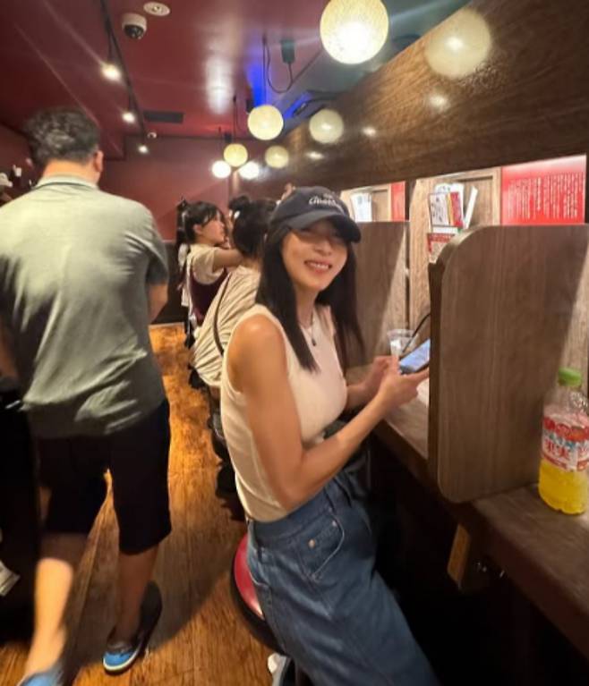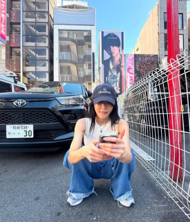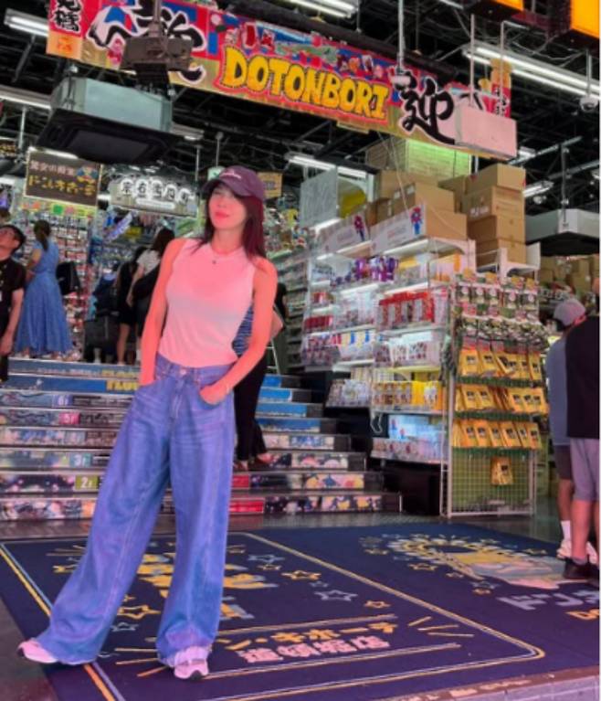 다른 사진 속 하지원은 와이드핏 연청 데님에 동일한 화이트 슬리브리스를 매치했습니다.