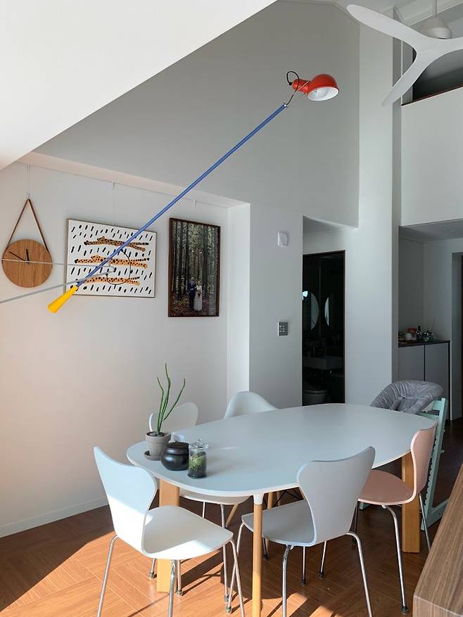 층고가 높아 루시에어의 실링팬을 설치했구요. 실링팬을 사용할 때 천장 매립 조명의 그림자 공격을 피하기 위해 알록달록한 벽등을 따로 달았어요. 삼색 컬러가 포인트인 이 조명은 사용하지 않을 땐 벽으로 밀어놓아요.