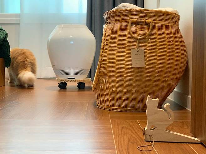 거실 한켠엔 다정한 저희 집 고양이 모찌의 공간과 레어로우의 시스템 선반을 설치해서 티백이나 커피를 정리해두었어요. 거실에서 음악을 자주 틀어놓는데 뱅앤올룹슨의 A1 스피커는 사이즈는 컴팩트 하지만 사운드가 풍부해요.