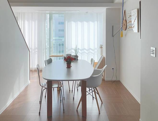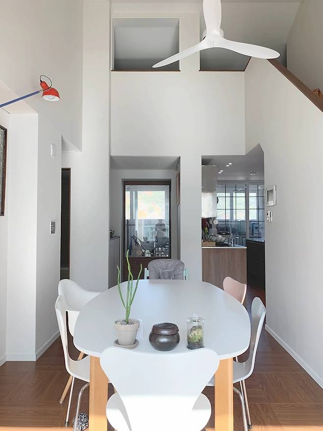 계단을 놓으면서 다락 입구 방향도 바꾸고 환기와 개방감을 위해 내력벽을 피해 창을 만들어 주었어요. 일반 아파트에선 잘 볼 수 없는 구조에 이국적이기도 해서 집을 더 특별하게 만들어주는 것 같아요.