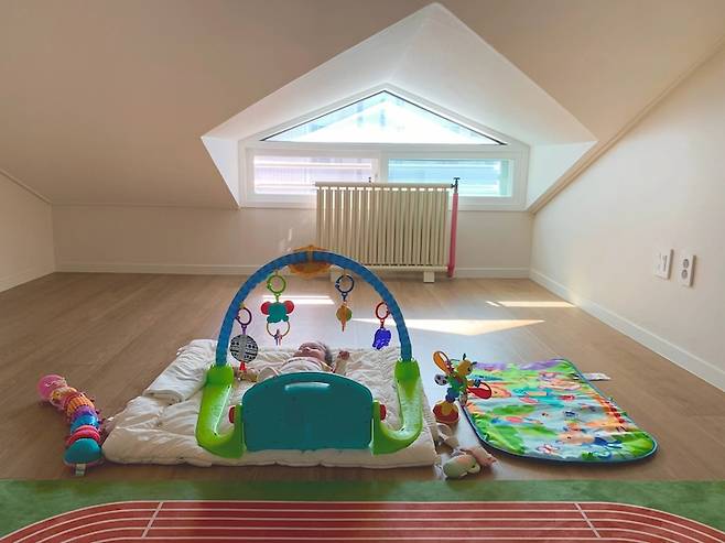 창이 있는 다락은 아기가 태어나기 전엔 저의 홈 짐으로 사용되던 공간이었는데 아이가 태어난 후 아기의 놀이방이 되었어요. 크고 알록달록한 아기 장난감을 모두 올려서 아직 1층 생활 공간의 톤을 유지할 수 있게 해주는 고마운 공간이에요. 아기가 조금 크는 내년 봄 쯤엔 본격적으로 놀이방으로 꾸며줄 예정이에요.