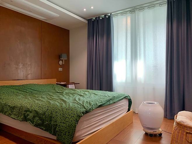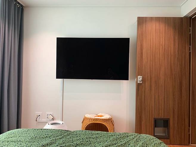 저와 남편, 모찌가 자는 침실은 따뜻하고 편안한 느낌이었으면 해서 침대 헤드 쪽 벽을 합판으로 마감했어요.