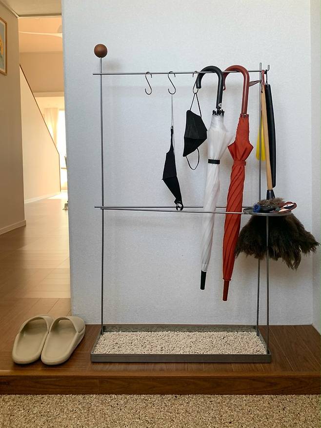 스틸로 제작된 심플한 우산걸이는 NNN의 제품으로 우산과 함께 마스크와 차키를 올려 둘 수 있어 실용적이에요. 바닥에 자갈도 포함된 제품인데 전실의 콩자갈과 잘 어울려요.