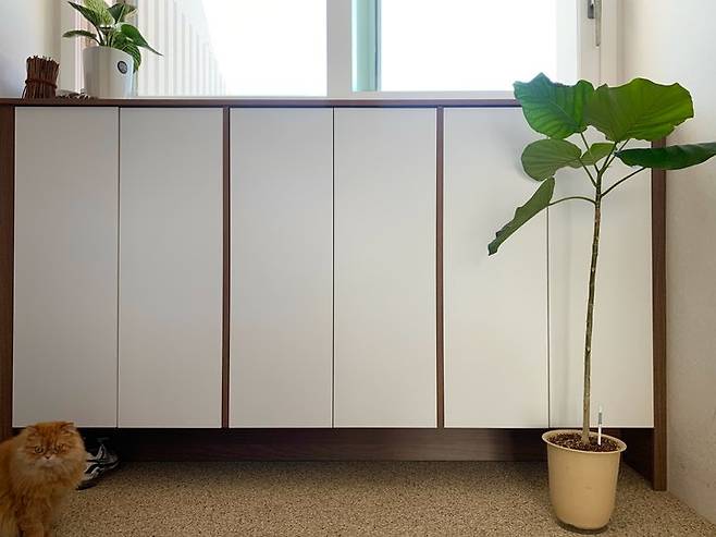 전실의 톤을 정리하고 수납 공간을 만들었어요. 7살인 반려묘 모찌는 늘 저를 쫓아다니며 뭘 하는지 감시하는 호기심 많은 고양이에요.
