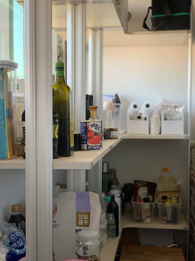 주방과 연결된 뒷 베란다에는 냄비를 보관하고 앞 베란다가 협소해서 설치하지 못했던 의류건조기도 뒷베란다에 설치했어요. 아기의 맘마존과 팬트리를 만들어 주방 공간을 좀 더 확보할 수 있어요. 팬트리에는 실온 보관이 가능한 식재료와 밀폐용기 등을 보관하고 있어요.
