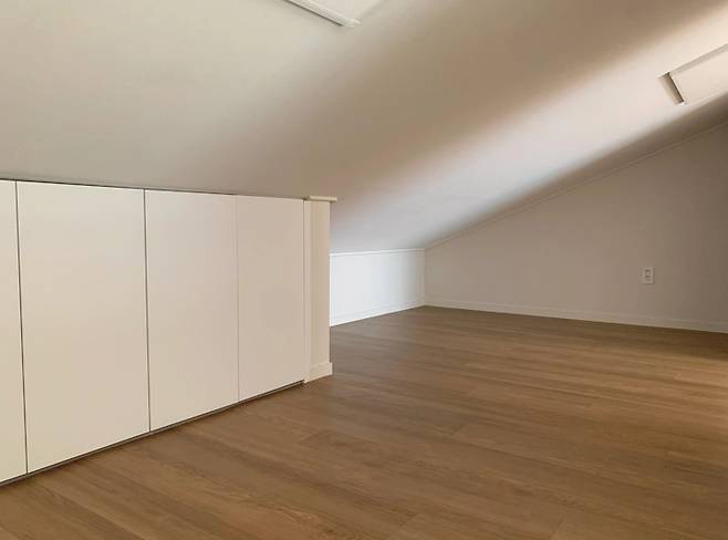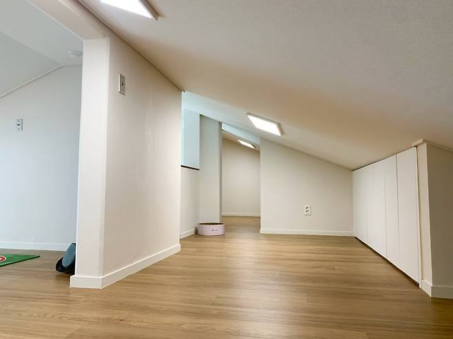 다락은 디귿자 구조인데 가운데 복도를 기준으로 왼쪽 다락은 창이 없고, 오른쪽 다락은 삼각형의 창이 있어요.