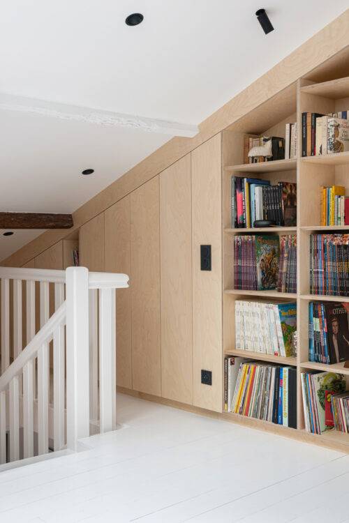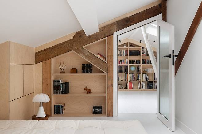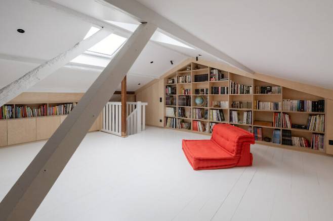30년 넘게 창고로 쓰이던 빌라의 다락방이 가족 모두의 쉼터로 바뀌었다. 벤치를 짜넣고, 자작합판으로 전면 책장을 맞춤 제작해 독서 공간으로 만들었다. 층고를 높이기 위해 기단을 제거하면서 개방감을 확보했고, 다락방 특유의 낮은 천장도 아늑한 분위기로 연출되었다.