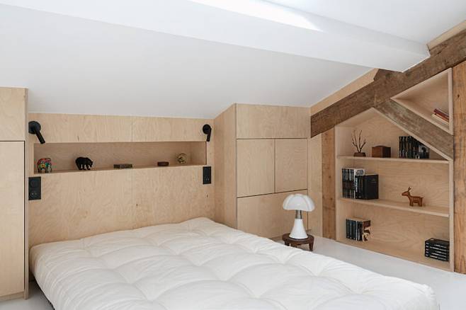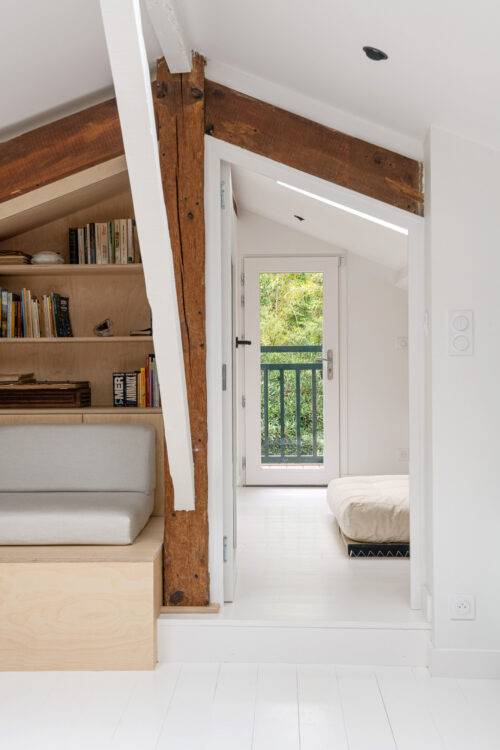 다락방의 두 공간은 불투명 유리문으로 분리해 프라이버시는 지키면서도 채광은 공유할 수 있도록 구성했다. 독서방엔 천창이, 침실엔 발코니 창이 있어 양쪽 모두 자연광이 풍부하다. 빛이 흰색 바닥에 반사되어 실제 면적보다 넓어 보이는 효과도 얻었다.